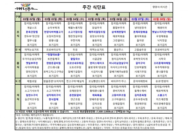 3월 첫째주 식단표 페이지 정보 작성자 은천노인복지회 작성일26-02-27 13:13 조회22회 댓글0건 관련링크 다음글 목록 답변 본문 2월 넷째주 어르신 식단표 안내해 드립니다. 정성과 영양을 담아 준비하겠습니다. 다음글 목록 답변