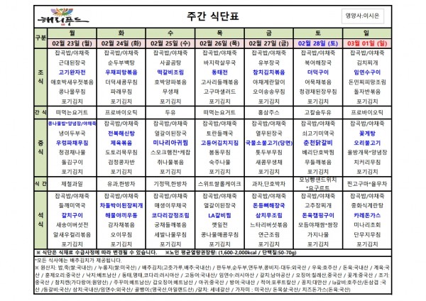 2월 넷째주 식단표 페이지 정보 작성자 은천노인복지회 작성일26-02-20 16:17 조회500회 댓글0건 관련링크 다음글 목록 답변 본문 2월 넷째주 어르신 식단표 안내해 드립니다. 정성과 영양을 담아 준비하겠습니다. 다음글 목록 답변